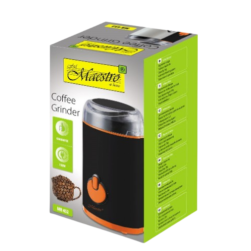 Виріб зрозумілий і зручний у використанні, система помелу представлена у формі ножа, який подрібнює зерна. Ножі Maestro MR-452 виготовлені з неіржавкої сталі, встановлена автоматична система блокування. Потужність приладу становить 150 Вт, що забезпечує швидкість і якість виготовлення.
