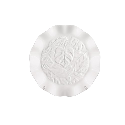 Блюдо сервірувальне — білосніжний столовий сервірувальний посуд із фарфору. Оригінальна та стильна форма з рельєфною окантовкою у формі листя монстери. Діаметр тарілки 26 см, висота — 4 см. Посуд колекції "White City" спеціально створений для інтенсивного щоденного професійного та домашнього використання. Можна мити в посудомийній машині та використовувати для підігрівання в мікрохвильовій печі. Упаковані в картонну коробку.