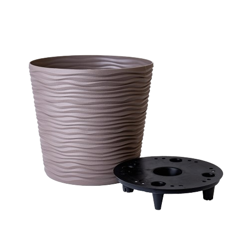Вазон "Ф'южн" низький має сучасний оригінальний дизайн. Поверхня вазона матова, рельєфна у формі горизонтальних хвиль, що надають вазону особливої родзинки. Виріб складається з вазона та внутрішньої вставки.