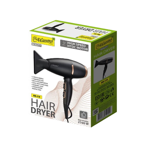 Фен для волосся Maestro MR-218 — це потужний і функціональний прилад, призначений для швидкого й ефективного сушіння та укладання волосся. З потужністю 2100 Вт він забезпечує високу продуктивність і швидкий результат. Надійний HTDC мотор розрахований на тривале використання, що робить фен придатним як для домашнього, так і для професійного застосування.